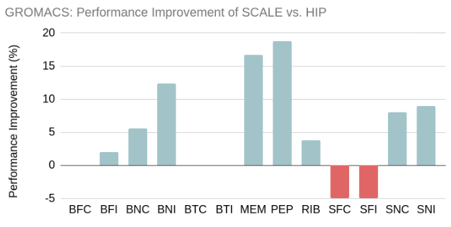 The chart below shows the relative performance of HIP (ROCM 6.3.1) vs. SCALE 1.3.1 on the Max Planck Institute GROMACS benchmarks, running on a single MI210 GPU. Negative performance improvement represents cases where SCALE was slower than HIP, while positive values represent performance improvements.