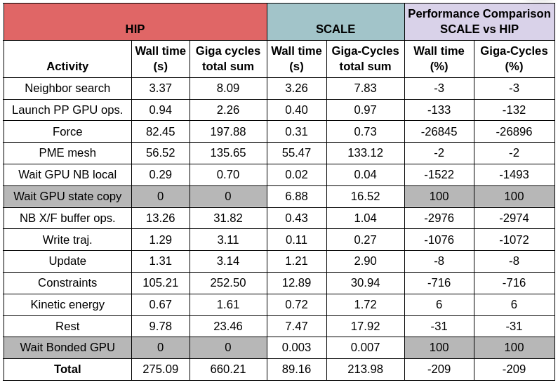 To get a more fine-grained understanding of the differences seen here, we turn to GROMACS’ internal performance counters. These measure the time spent in each part of the application, allowing us to directly compare the performance of individual kernels (or groups thereof) compiled with SCALE vs. their HIP replacements. Since there is not a 1-1 mapping between CUDA kernels and HIP kernels in the two implementations, this approach is more meaningful than simply timing individual kernels.