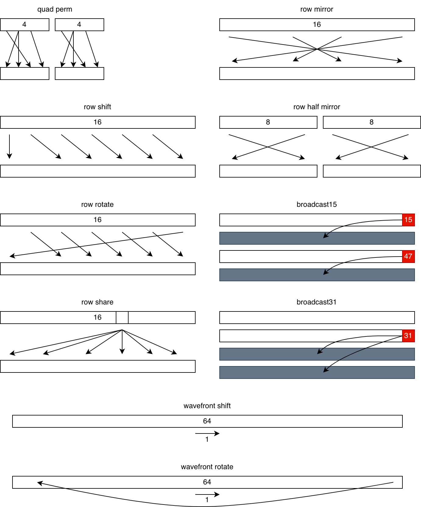 • quad perm: do an arbitrary permutation within each group of 4 consecutive lanes.