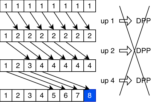 The shuffle optimisations we have been talking about certainly help with reductions and scans, since they are made of shuffles. But we may miss some opportunities to optimise if we only look at each step in isolation. This is because some sequences have individual shuffles that cannot be done by any of the more specialised hardware instructions, only bpermute. In the second sequence above, the shifts cannot be lowered to DPP. But if we know the overall result is a reduction, we can generate a completely different sequence of shuffles – where each one can be lowered to an efficient hardware instruction – whose overall effect is the same.